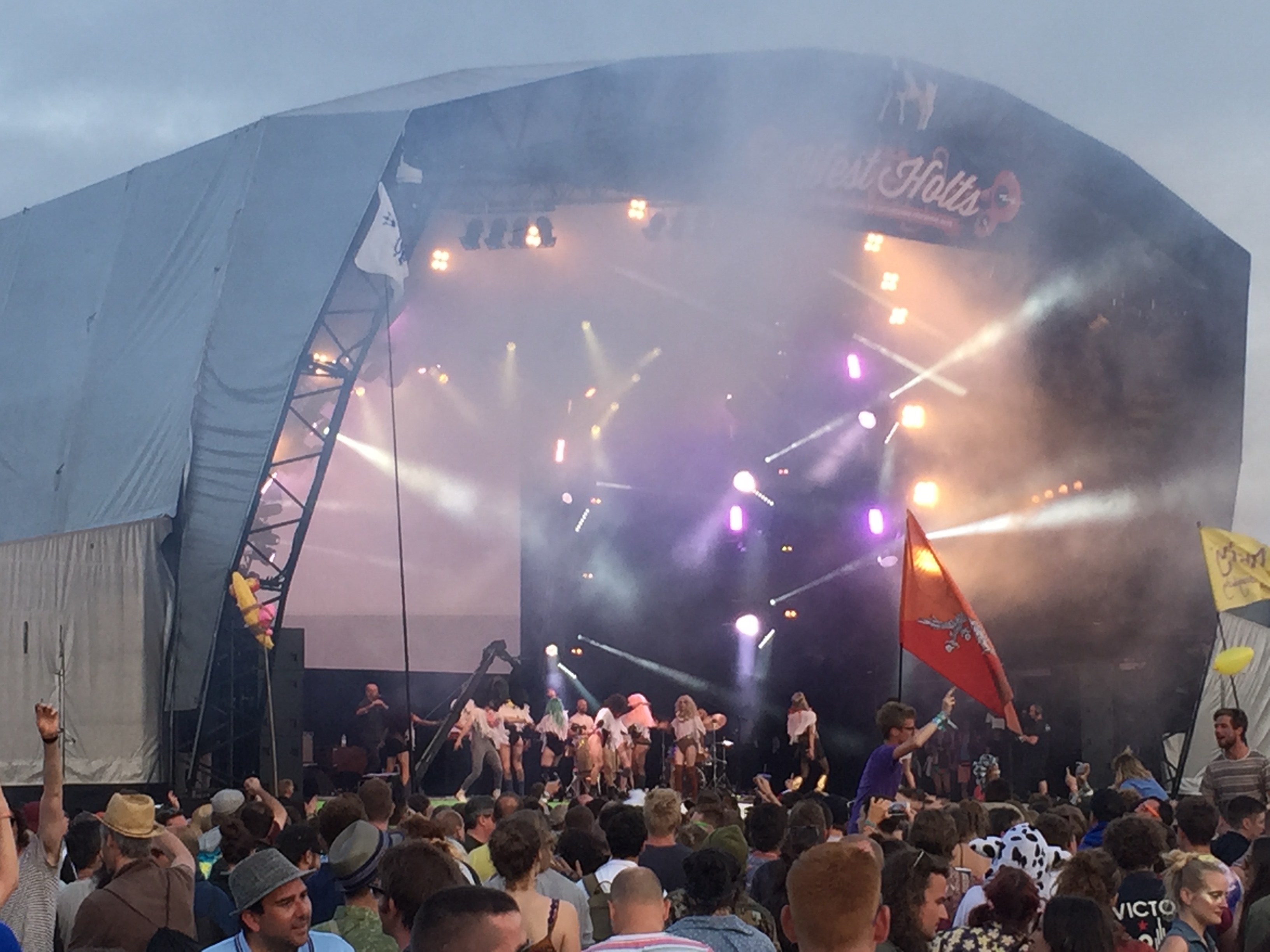 As twilight began to descend we opted for a very different sound and moved to the hill-free West Holts Stage. Initially the show had that feel of disconnection between one man in a box and the crowd but Terje stepped up his game with each track, having other musicians on stage with him and ultimately bringing a whole dance troupe on stage for the infectious ‘Inspector Norse’ crescendo. This is really a warm-up slot for the big one, the Saturday night headliner and we were warmed up nicely.