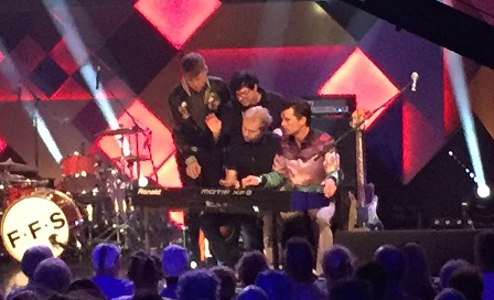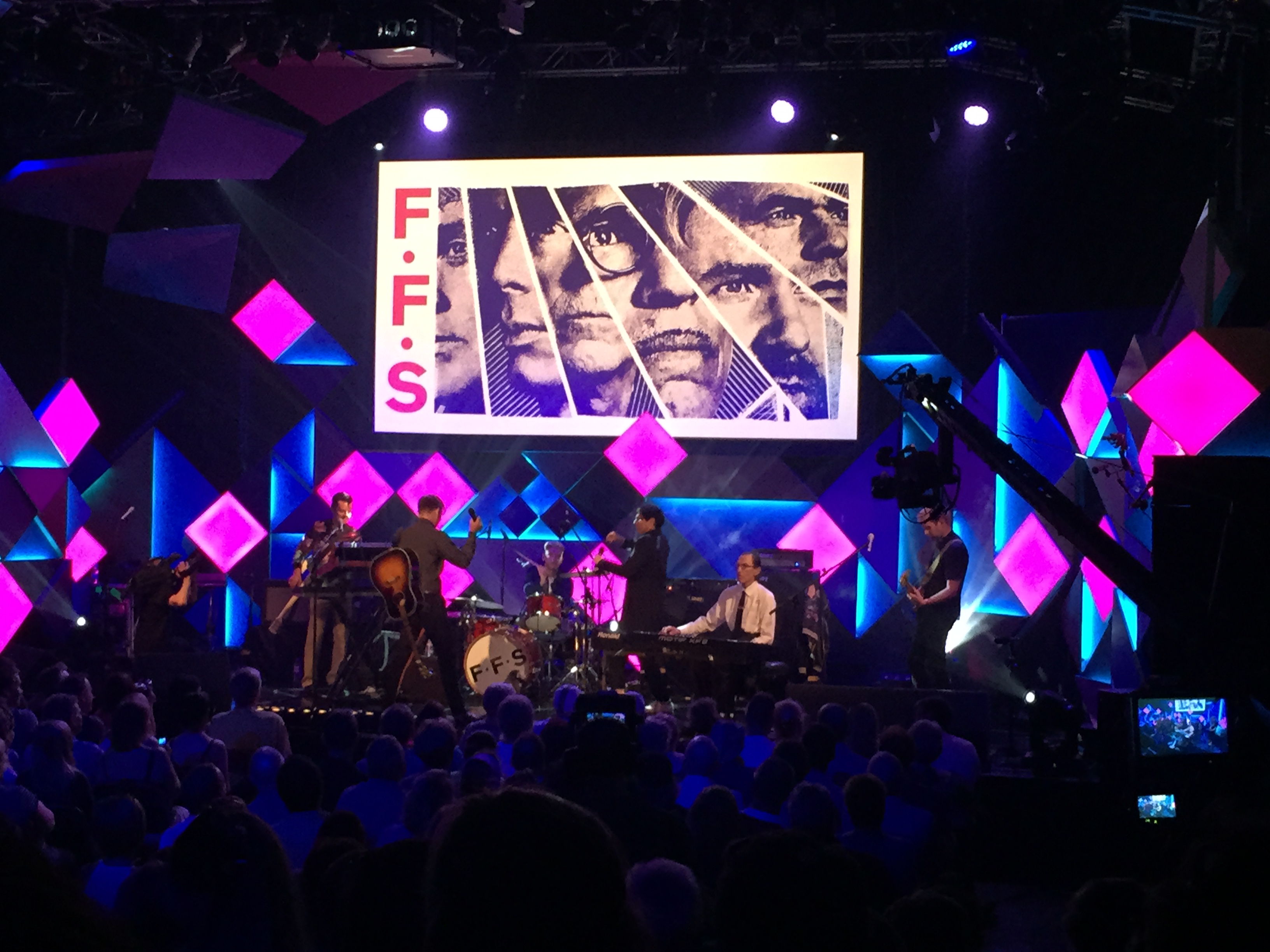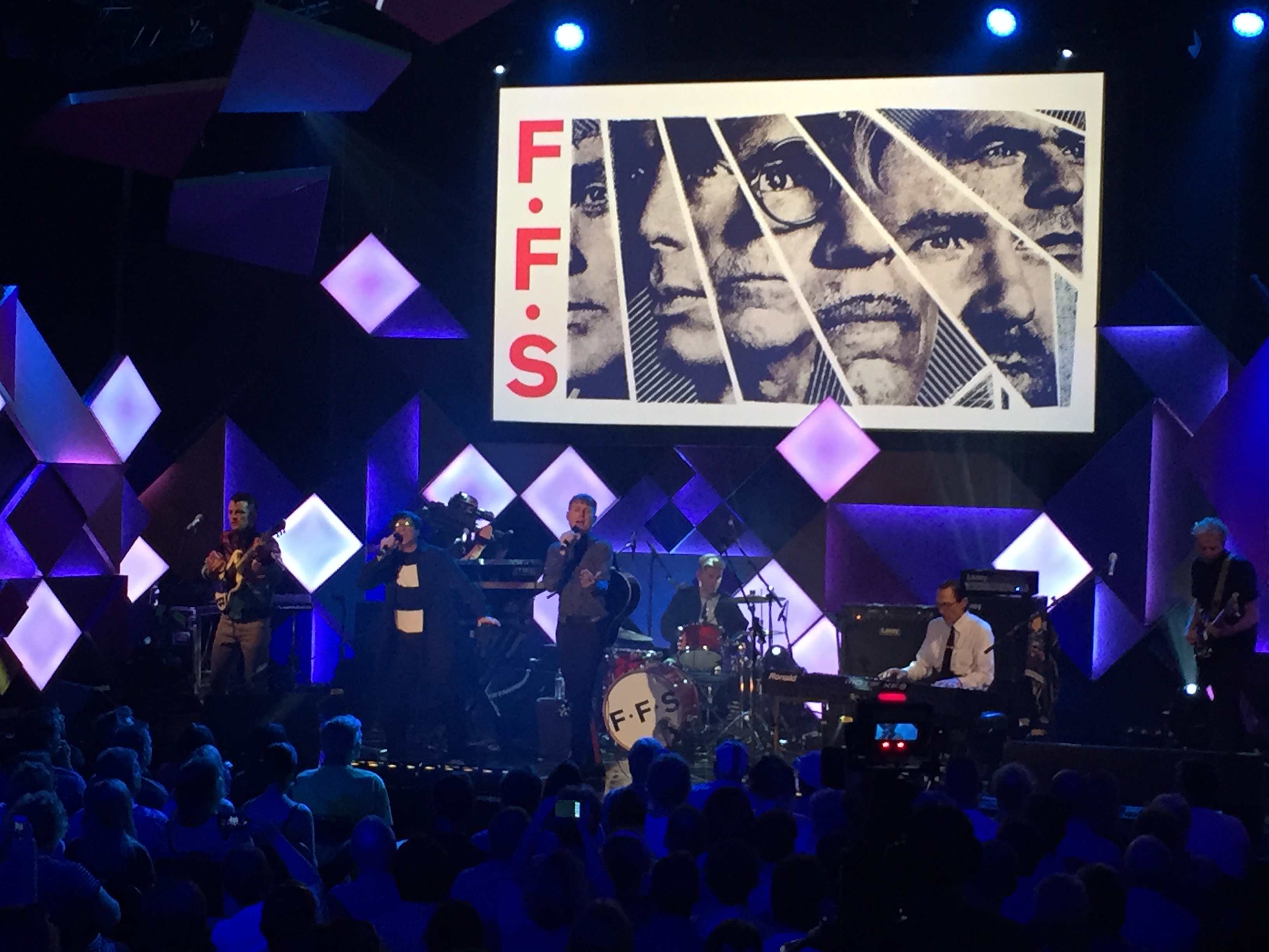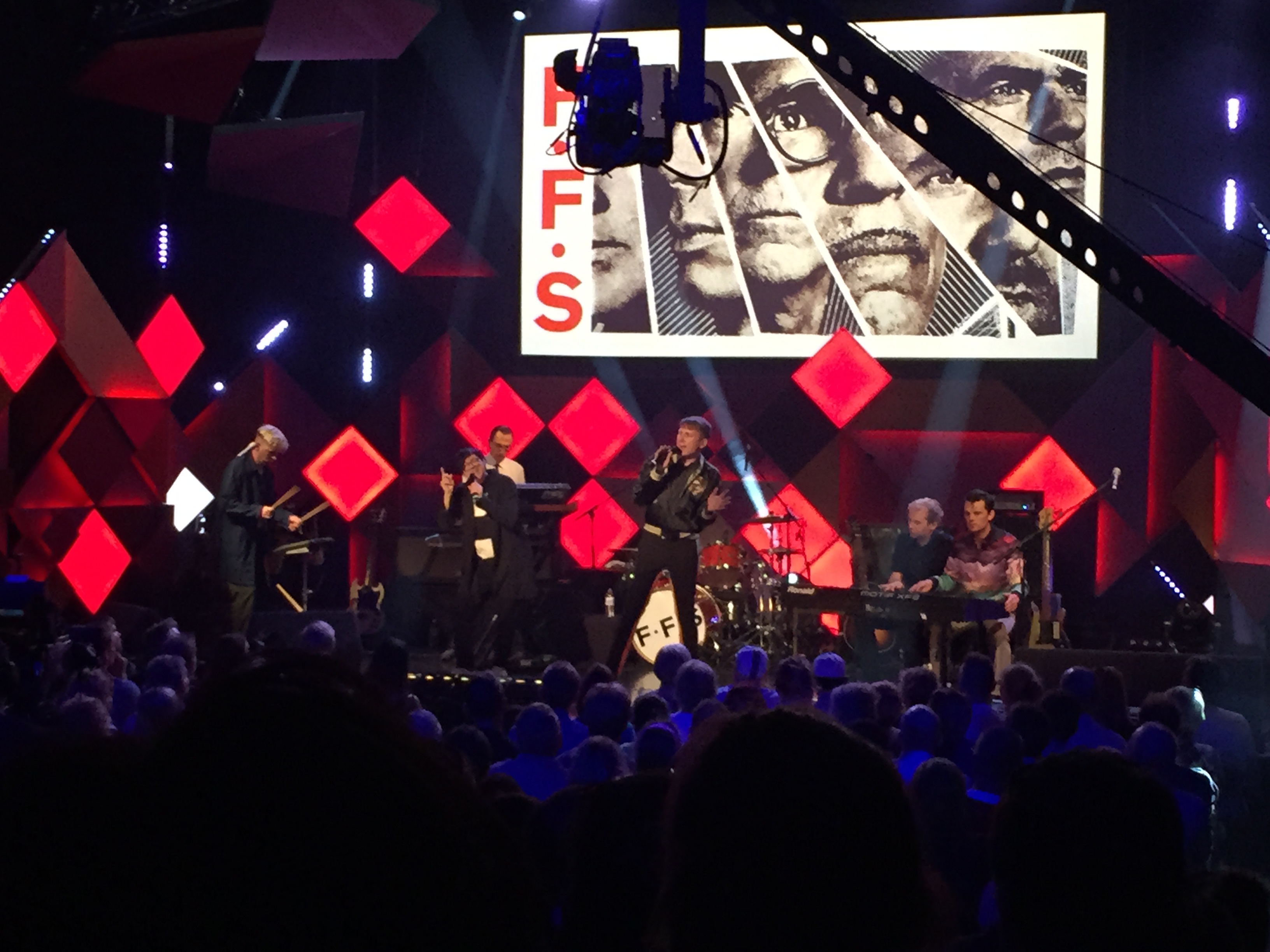 The elaborate sense of style of both frontmen Russell Mael and Alex Kapranos led me to think, what’s better than one frontman? Well, of course, two, when they’re like this anyway. The stark contrast of Russell’s over-the-top performance with Ron’s po-faced stiffness adds extra comedy value but also an air of authority. These guys have been part of music history so they can command it. FF guitarist is equally elaborately dressed which basically makes for rather an eclectic-looking group of musicians.